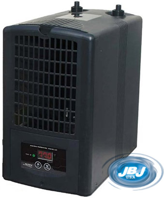 (Sizing Guide). Features built in temperature controller with digital display, titanium heat exchanger, black ABS cover, and a 2-year warranty. Unit produces some of the lowest noise and vibration levels of any chiller on the market. Recommended Flow Rate: 240 gph. Input/Output: 1/2", 5/8", 3/4" INS (Hose Barb). Using either an existing pump or an additional pump, water is circulated through the chiller, cooled, and returned to the aquarium or filter system. All models are safe for use in either salt or fresh water. For additional information, please visit the JBJ Lighting web site. Free Rio powerhead with purches if requested in the note section