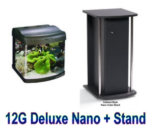 The 12 Stand compliments the tank perfectly.  The Nano Cube aquarium fits and will make a great addition to any room.