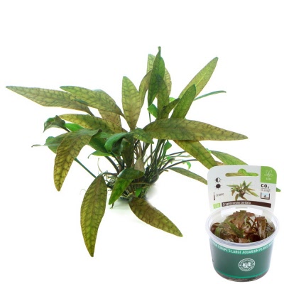 Cryptocoryne cordata grows in South Thailand, West Malaysia, Sumatra and Borneo. The varieties have leaves that can be very different in shape and color. This kind of cordata has narrower leaves than the more common heart-shaped variety. The top side of the leaf has an attractive streaked pattern and the underside is reddish. This plant fairs best in low-level lighting and softer water. After a certain period of adjustment, this Crypto can also live in harder water. Reaching a height of 20 cm (7 3/4 inch), this plant is ideal for the middle zone of the tank.